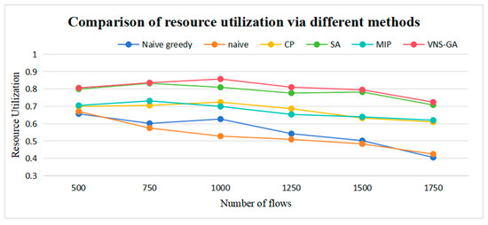 The higher the resource utilization rate, the more fully the equipment is utilized. Compared to the other three algorithms excluding the VNS-GA and SA, the resource utilization rate of the MIP algorithm increased by an average of 21.4%, 26.85%, and 2.37%, respectively. For the VNS-GA, the resource utilization rate increased by an average of 44.81%, 51.32%, 19%, and 2.57%, respectively, compared to the other four algorithms (excluding MIP). The resource utilization rates are illustrated in Figure 13. The traditional method effectively handles complex constraints. However, it may overlook the impact of certain constraints, leading to unreasonable resource scheduling. In contrast, the MIP method can accurately define and manage multiple constraints to ensure optimal resource allocation. The VNS-GA method achieves a balance within the solution space by dynamically adjusting constraints during the search process, thereby avoiding irrational resource allocation.