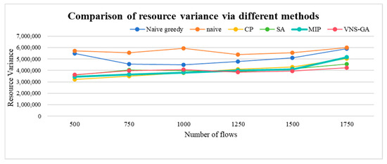 n represents the number of resource utilization rates, while Ui denotes the value of each resource utilization rate, indicating the average resource utilization. A lower variance in resource distribution implies a higher level of load balancing, ensuring equitable resource utilization. The proposed MIP algorithm, compared to Naive greedy, Naive, and CP, reduces the resource distribution variances by 12.63%, 21.2%, and 0.23%, respectively. This indicates that within a certain traffic of TSN networks, the MIP algorithm can more effectively utilize resources, achieving superior load balancing and ensuring equitable resource utilization. In comparison to the other four algorithms, the VNS-GA reduces the resource distribution variances by 22.17%, 30.59%, 1.75%, and 2.3%, respectively. This demonstrates the superiority of the VNS-GA in traffic scheduling, as it optimizes resource allocation more effectively, mitigating system load imbalances and enhancing overall system performance and stability. The resource distribution variances are depicted in Figure 14.