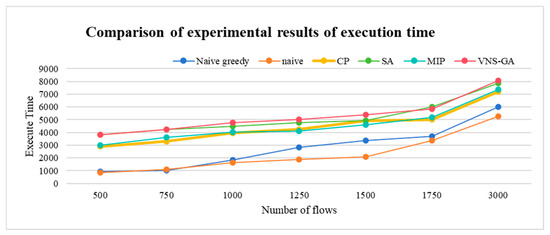 The VNS-GA requires more computational time compared to other algorithms, as it integrates various search strategies, specially VNS and the GA. This diversity aids in a more comprehensive exploration of the solution space, ultimately converging towards superior solutions. The execution time with up to 3000 flows is shown in Figure 15.