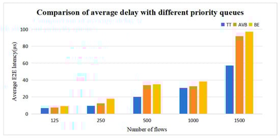 We compared the transmission delay of Multi-CQF with different priority queues. Considering the varying queue lengths for different priority levels, the queue length for TT flows is set as 250 μs, while for AVB and BE flows, it is set as 125 μs each. The simulation results further demonstrate that the transmission delay for TT flows is significantly less compared to the other two flows, with an average reduction of approximately 30.49% and 37.15%, respectively. This indicates that under the same TSN network conditions, TT flows can achieve faster transmission and reach their destination more quickly, whereas AVB and BE flows exhibit longer transmission delays. These findings underscore the importance of prioritization in TSN network data transmission, particularly in scenarios necessitating swift transmission and timely responsiveness. The results are illustrated in Figure 16.