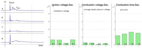 The standard diagnostic measurement procedure on the secondary side of the ignition module of a four-stroke, four-cylinder MPI engine is presented in Figure 1. These parameters were measured by a BOSCH FSA 720 module on four cylinders. The results show that there is a clear deviation, and it is very difficult to determine what is causing the anomaly. It can be caused by a malfunction of the ignition module, degradation of the spark plugs, failure of the injector, pressure, or another reason. The implemented on-board diagnostic algorithms do not allow the service technician to diagnose the current condition without a history of records []. For this reason, historical records or often-used appropriate diagnostic methods or simulations are necessary.