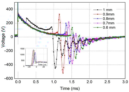 Figure 5 shows the arc duration curves of a spark plug at different gap distances. The measured curves showed that the spark plug gap had a significant effect on the arc duration. As the distance increased, the arc duration also decreased. The difference between the minimum and maximum measured distances was as much as 0.55 ms.