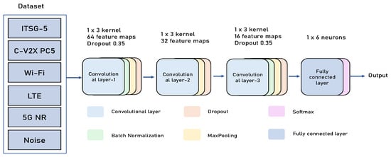 The dataset utilized in this study comprises six distinct categories: CV2X, 5G, ITSG5, LTE, Noise, and Wi-Fi, representing various wireless signal types and noise commonly encountered in real-world communication systems.