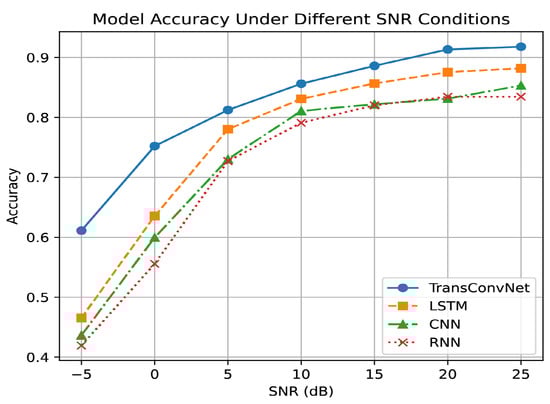 To evaluate the robustness of the proposed TransConvNet under varying SNR conditions, we compared its performance with baseline models at SNR levels ranging from −5 dB to 25 dB. The accuracy of each model at different SNR values is illustrated in Figure 3.