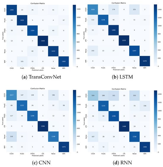 Confusion matrices are used to demonstrate the performance of each model in recognizing six wireless signal classes [46]. The proposed TransConvNet combines the local feature extraction power of convolutional layers with the global attention mechanism of Transformer encoders. Figure 4 reveals that the TransConvNet model achieves superior classification performance, reducing misclassifications significantly. Notably, CV2X, LTE, and Wi-Fi classes exhibit higher recognition accuracy, with fewer instances of misclassification.