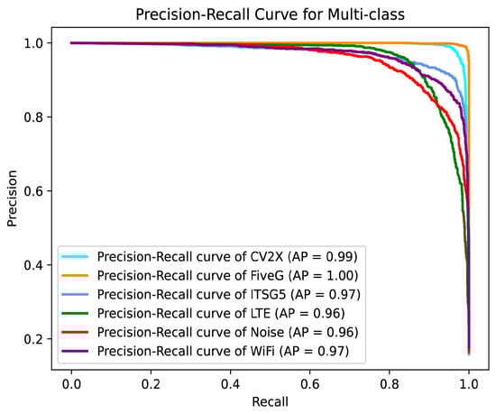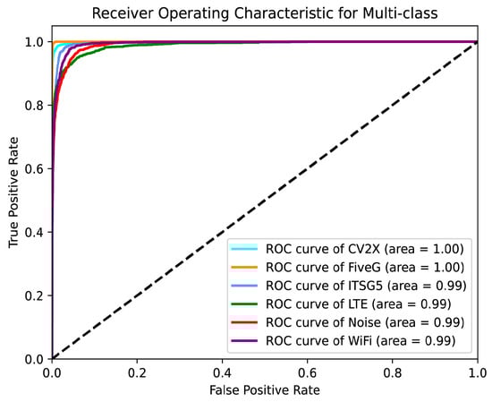 The PR curves show that the model maintains high precision across all six classes while achieving high recall. These results highlight the model’s ability to accurately identify positive samples and its robustness in maintaining high precision even as recall increases. The ROC curves demonstrate the model’s ability to distinguish between the six signal classes. All ROC curves are close to the top-left corner, and the Area Under the Curve (AUC) values for all classes are exceptionally high. The CV2X and FiveG classes achieve a perfect AUC of 1.00, while the remaining classes achieve AUC values of 0.99. These results indicate that the model has excellent discriminative power and a low false positive rate across all signal classes.