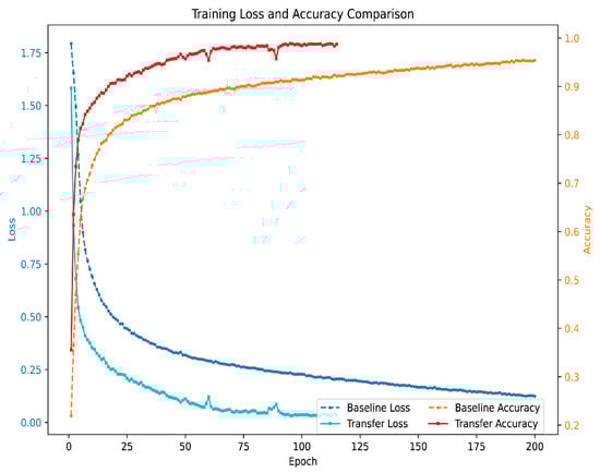 The effectiveness of transfer learning is particularly evident when training on small datasets. With only 6 classes and 100 samples per class, the model using transfer learning achieves faster convergence and higher accuracy compared with training from scratch. As shown in Figure 7, transfer learning significantly reduces the training time and loss, allowing the model to reach optimal performance with fewer epochs. This highlights the advantage of leveraging pre-trained weights, especially when labeled data is limited.