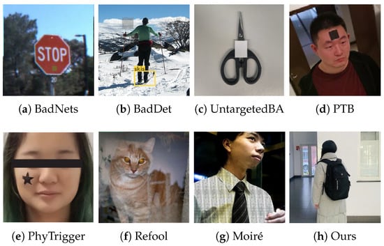 63. Wei, H.; Yu, H.; Zhang, K.; Wang, Z.; Zhu, J.; Wang, Z. Moiré backdoor attack (MBA): A novel trigger for pedestrian detectors in the physical world. In Proceedings of the 31st ACM International Conference on Multimedia, Ottawa, ON, Canada, 29 October–3 November 2023; pp. 8828–8838. [Google Scholar]