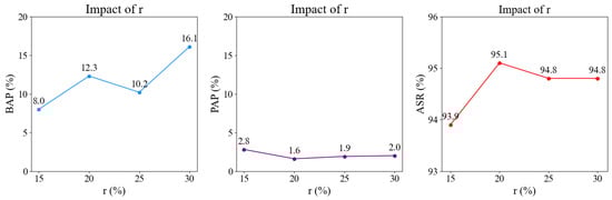 Figure 8. Impact of the occlusion ratio r. We present the variation curves of BAP (%), PAP (%), and ASR (%) under different r values for poisoned RetinaNet on the CityPersons dataset.