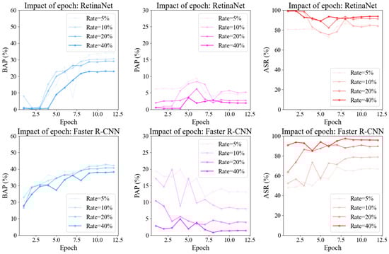 Figure 9. Impact of training epochs. We present the evolution of BAP (%), PAP (%), and ASR (%) across epochs for poisoned RetinaNet and Faster R-CNN on the KITTI dataset.