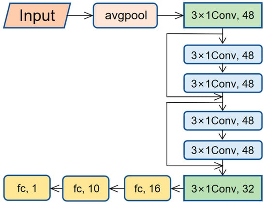 This research developed a 1D-ResNet model utilizing spectral data characteristics. The model’s input consists of log-transformed (logR) spectral reflectance data, with a dimensionality of 2100. To improve computational efficiency and extract key features, the first layer applies average pooling with a window size of 10, reducing the dimension to 210. The data then passes through a 1D convolutional layer (48 filters, kernel size 3, stride 1, Leaky ReLU activation function with α = 0.01) for feature extraction, followed by batch normalization to optimize data distribution. The data subsequently undergoes max pooling with a window size of 2, followed by two residual blocks (with ReLU activation and skip connections). Afterward, it advances through a 1D convolutional layer (32 filters), a flattening layer, and two dense layers (16 and 10 nodes, using Leaky ReLU activation). The output layer consists of a single-node dense layer with ReLU activation. All convolutional and fully connected layers use L2 regularization (λ = 0.0004). The specific network architecture is shown in Figure 2 and Table 1.