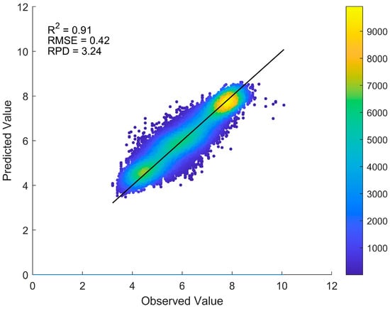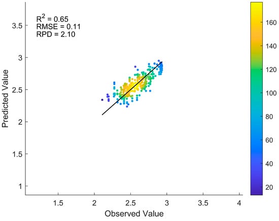 Model performance is assessed using the coefficient of determination (R2), root mean square error (RMSE), and residual prediction deviation (RPD). R2 indicates the extent of variance in the data accounted for by the model, with values nearer to 1 signifying improved model fit. RMSE quantifies the average discrepancy between predicted and actual values, with lower values reflecting greater prediction precision. RPD evaluates the ratio of standard deviation to residuals to gauge prediction reliability, with RPD < 1.4 indicating inadequate prediction, 1.4 ≤ RPD < 2.0 suggesting acceptable performance, and RPD ≥ 2.0 representing superior prediction [].
