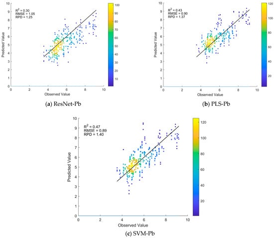Predicted vs. observed Pb values for ResNet, PLS, and SVM models based on 10 random sampling tests in the target domain. The average evaluation metrics are shown in the upper-left corner.