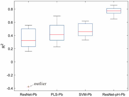 Boxplot comparison of R2 values for Pb prediction among the ResNet-pH-Pb, PLS-Pb, SVM-Pb, and ResNet-Pb models.