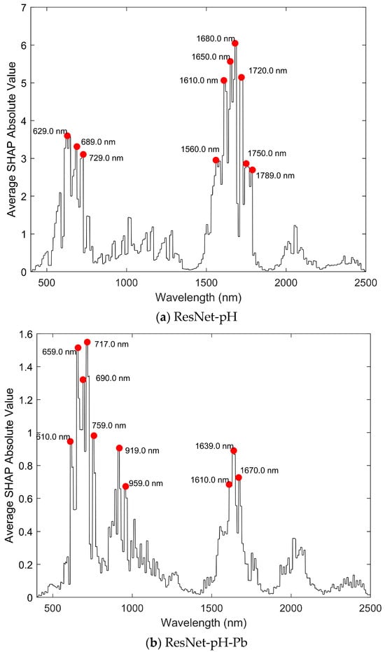 To explore the contribution of different wavelengths in ResNet modeling, SHAP values were used to interpret the source domain model ResNet-pH and the transfer learning model ResNet-pH-Pb, as shown in Figure 7.