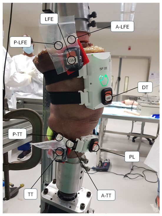 Kinematic measurements of the cadaveric knee specimens were obtained using the GATOR system and a reference IMU system (Xsens DOTS). Xsens DOTS was selected as the reference standard in this cadaveric study due to its demonstrated reliability and accuracy in multiple biomechanical investigations [40,41,42,43,44]. In particular, it has shown low root mean square errors (RMSE) below 5° for walking [42,45], along with excellent coefficients of multiple correlation (>0.9886) during repeatability analyses [42], when benchmarked against Vicon systems and models. Owing to its robust performance in gait analysis, sports performance assessments, and clinical evaluations, Xsens DOTS is widely recognized as a dependable wearable IMU platform for lower-limb motion capture [40,41,42,43,44]. By benchmarking GATOR against such an extensively validated system, this study provides a reliable comparison when assessing knee flexion and rotational stability measurements, see Figure 1.