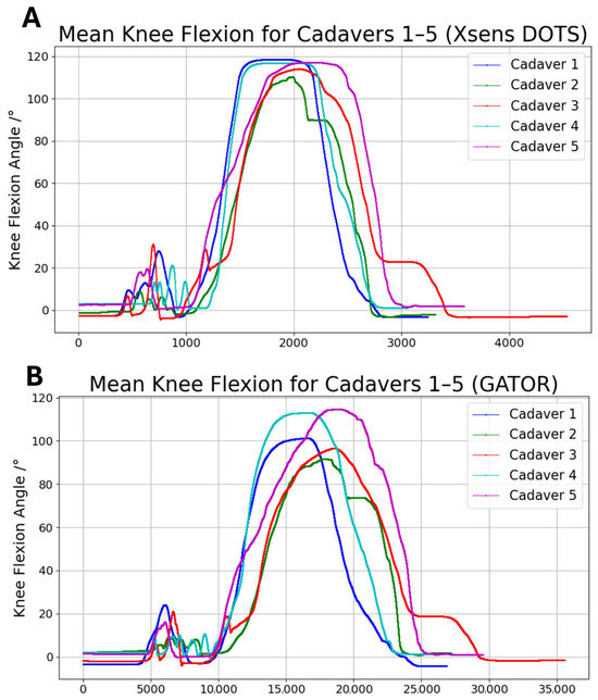 Comparison of mean knee flexion angles measured by (A) Xsens DOTS and (B) GATOR for cadavers 1 (blue), 2 (green), 3 (red), 4 (cyan), and 5 (purple).