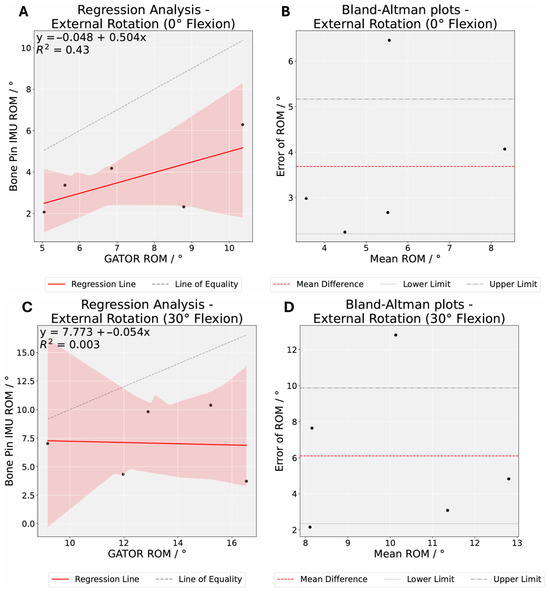 As noted in Experiment A, near-pivot sensor placement contributed to the inaccuracies in knee rotation angle measurements observed in Experiment B [51,52,58]. Furthermore, Steinmann pins inserted near the tibial tubercle and lateral femoral epicondyle may introduce subtle mechanical constraints that disproportionately affect external rotation at moderate knee flexion angles. Although these pins are meant to provide stable, bone-anchored reference points, their rigidity can unintentionally restrict or alter the knee’s natural rotation arc under quadriceps tension and weight-bearing loads [54]. This combination of near-pivot sensor placement and possible pin-induced mechanical resistance helps explain why external rotation measurements exhibit greater mean bias and random errors compared to internal rotation, with pronounced deviations at moderate knee flexion angles.