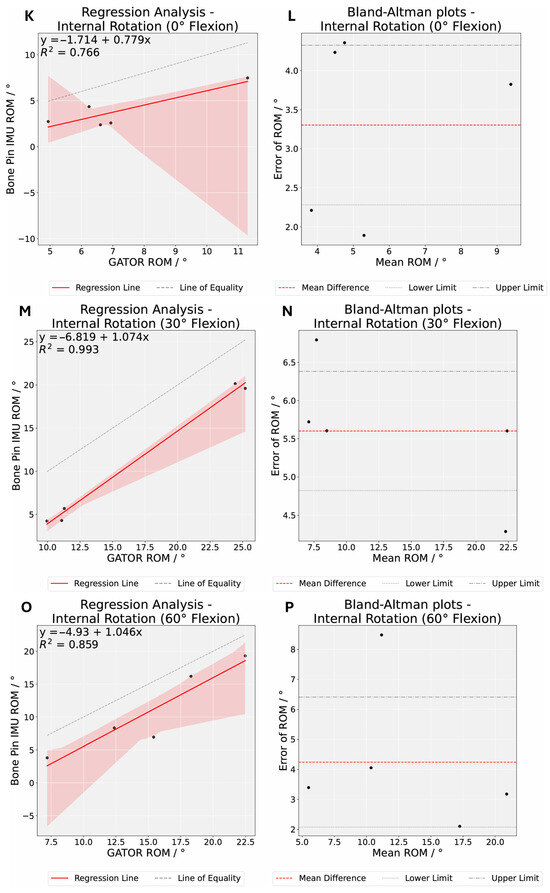 Additionally, our findings show a consistent positive mean bias for both external and internal rotation (Xsens DOTS IMU Mean–GATOR Mean), presumably due to the systematic overestimation of Xsens DOTS. This outcome aligns with the phenomenon of IMU drift, where integration of small errors in gyroscope and accelerometer measurements accumulate over time, causing incremental deviations from the true orientation or motion [40,54,55,56,60]. As a result, the IMU’s internal orientation estimate can drift in a single direction due to uncompensated gyro bias [61]. Although Xsens DOTS employs an onboard Kalman filter (XKF) to mitigate drift [40], any residual bias or imperfect magnetometer correction can gradually inflate measured rotation angles. These findings concur with Bailey et al. [62], who reported an overestimation of 3.1–6.8° in lower-limb rotations using Xsens DOTS, closely matching the magnitudes we observed. Consequently, the accumulated drift manifests as a consistently higher measurement in Xsens DOTS, resulting in a positive bias.