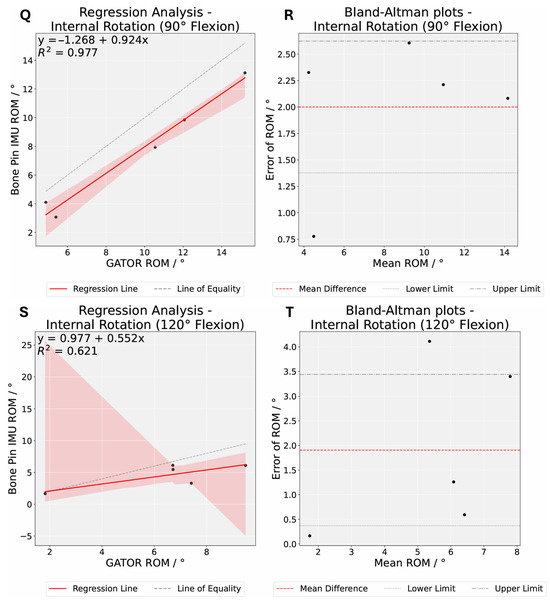 Regression and Bland–Altman analyses comparing knee rotation angle measurements between Xsens DOTS and GATOR systems. Regression analysis describing the correlation of measurements for knee rotation angles between the two systems for external rotation at knee flexion 0° (A), 30° (C), 60° (E), 90° (G), and 120° (I), and internal rotation at knee flexion 0° (K), 30° (M), 60° (O), 90° (Q), and 120° (S). Bland–Altman plots demonstrating the difference in knee rotation angles between the two systems for external rotation at knee flexion 0° (B), 30° (D), 60° (F), 90° (H), and 120° (J), and internal rotation at knee flexion 0° (L), 30° (N), 60° (P), 90° (R), and 120° (T). The dashed gray lines represent the 95% limits of agreement, corresponding to two standard deviations of the mean difference.