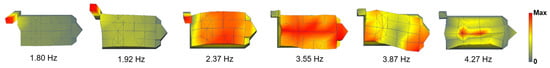 For the sixth mode, the primary contributors were the concrete slab and the non-structural infill above the vaults. As previously noted, these elements involve a high degree of uncertainty due to limited available information. Their corresponding Young’s moduli were used as calibration parameters, and the tuning process led to a substantial increase in stiffness, especially for the weak infill layer, which in turn raised the frequency of this mode. This frequency increase caused a shift in the original fourth mode, which eventually appeared as the sixth, thereby improving the alignment and ordering of the final three modes. The final values adopted for each variable after calibration are presented in