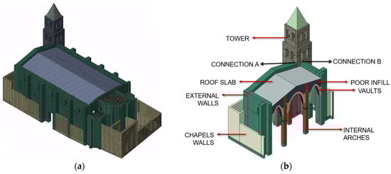 Among the elements used to define the geometry of the nave are the perimeter walls, arches, and interior columns. These components presented a relatively low degree of uncertainty due to their straightforward geometries, ease of access, and the availability of visual inspection and non-destructive testing data to inform their material characterisation. In contrast, the roof structure was defined with a higher level of uncertainty. Although its geometry was externally captured through photogrammetry, the internal configuration, including cross-sections and constructive infill, was based on historical and technical literature [