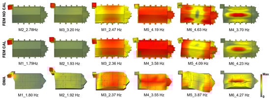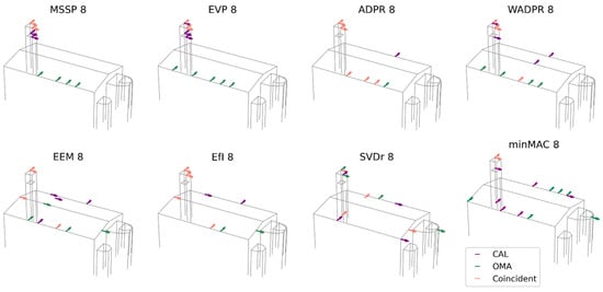 The first comparison involves the modal shapes obtained from the experimental campaign (OMA) and the calibrated finite element model (FEM CAL), which are expected to yield similar results. In this initial analysis, the six identified modes are targeted to optimise the placement of eight uniaxial sensors. The obtained results are presented in
