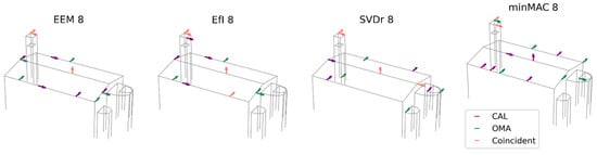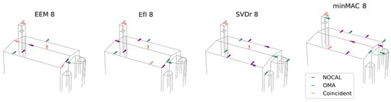 51], which in this case is six. Nevertheless, taking into account the geometric complexity of the structure and the variability of modal shapes involved, the number was increased to eight. This selection is considered sufficiently detailed to allow for meaningful observations across different configurations, while remaining manageable in terms of computational and interpretative effort. This number offers enough flexibility to explore the influence of sensor location on the quality of the results and supports a more robust evaluation of the proposed metrics and methodology.