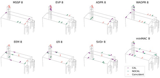 The average number of coincident sensors increased to 4.25, with a broader range of coincidence spanning from 2 to 7 sensors. As in the previous case, most of these overlaps occur at the top of the tower, where up to four sensors coincide. However, in the nave, the number of matches varies between zero and three, showing a slight increase compared to the previous scenario. Among the analysed metrics, ADPR exhibits the highest number of coincidences, with seven out of eight sensors aligning, followed closely by EfI with six. Conversely, minMAC registers the lowest level of agreement, with only two coincident sensors in the tower, as in the previous scenario. Regarding the nave, ADPR and SVDr show the greatest alignment, with three coincident sensors.
