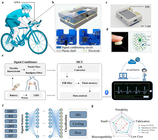 Wearable system for daily life ECG monitoring. (a) Schematic diagram illustrating the MWS worn on the human body or mounted on a bicycle handlebar. (b) Components of the MWS. (c) Physical image of the fully assembled MWS. (d) Schematic illustration of the adhesive properties of the FBE. (e) Signal processing workflow of the MWS for ECG signal analysis. (f) Structure overview of the model used for motion intensity classification. (g) Comparative analysis of this work with other related studies.