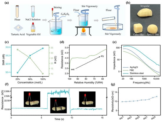 The high-quality ECG signal acquisition in this system is attributed to the excellent conductivity of the FBE, which is composed of an electrolyte solution (NaCl solution), flour, tartaric acid, and vegetable oil. As illustrated in Figure 2a, the FBE is fabricated through a simple process of mixing and heating these components, with detailed preparation steps provided in the Section 2.