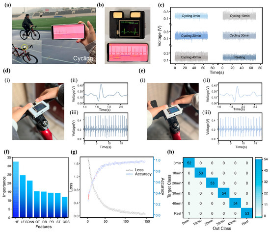 Model for motion intensity classification using the MWS. (a) Subject using the MWS for ECG monitoring during cycling. (b) Real-time ECG waveform display of the MWS on the screen and the smartphone application (APP). (c) ECG monitoring of Subject E during cycling at different time points. (d,e) Sweat resistance testing of the FBE. (f) Contribution analysis of ECG signal features used for model training. (g) Changes in classification accuracy and loss metric. (h) Confusion matrix comparing predicted and true labels after 146 training epochs.