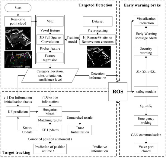 In order to realize the real-time communication between the environment sensing module and the planning and control modules, a distributed architecture Robot Operating System (ROS) is used [17]. The sensing system and the control strategy designed in this paper is given in Figure 2, which includes the target detection module, the target tracking module, and the whole machine interaction interface (namely the early warning braking module in this paper). The communication of multiple modules is realized through the ROS. When performing the sensing task, the detection module inputs the point cloud information scanned by LiDAR in real time, and outputs the information of the surrounding targets of interest, such as category, location, size, orientation, and confidence level, which is sent to the visual interactive interface for viewing through the ROS. When each frame detection task is carried out, the output detection information is input to the tracking module in real time. The tracking module uses the detection information of the previous frame to initialize the tracker, and predicts the prediction information of the current frame through the Kalman filter. Then, the Hungarian matching algorithm is used to match the detection information of the current frame with the prediction information. The corrected tracking information is obtained to realize continuous trajectory tracking of multiple targets in consecutive point cloud frames. Finally, the predictive ability of the tracker is used to obtain the target position of the next frame, and the prediction information is transmitted to the safety module through the ROS. The safety module starts to judge the safety distance after receiving the prediction information of each target of the next frame, and different warning safety thresholds and braking safety thresholds have been pre-set according to the different categories in the safety module. When the safety warning conditions are met, the module will send a warning prompt message to the visual interactive interface. When the emergency braking conditions are met, the module will send a reset message to the whole machine electric proportional pressure reducing valve through CAN bus communication. The corresponding emergency braking will be applied.