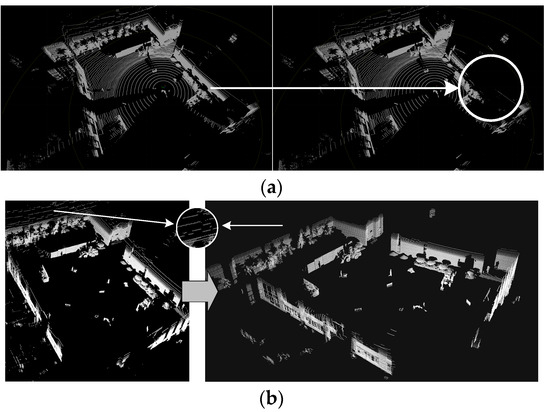 Point cloud preprocessing effect: (a) RANSAC error removes ground point cloud effect; (b) RANSAC combined with statistical filtering effects.