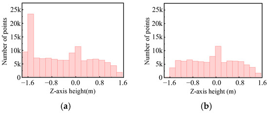 Since the RANSAC algorithm has randomness in initial point selection, it is prone to erroneous filtering when filtering ground points, as shown in Figure 6a. In order to select the correct initial points for plane fitting as much as possible, this paper filters the ground point cloud by restricting the height range of the selected points. To obtain the range interval where the ground points are located in the point cloud frames of the dataset, as shown in Figure 7, the height threshold of the selected points is obtained by counting the distribution of the points before and after the removal of the ground points of the point cloud in a single frame. The effect of the RANSAC algorithm combined with statistical filtering on the pre-processed point cloud data after limiting the height threshold is shown in Figure 6b. This approach not only accelerates the training speed of the algorithm model, but also facilitates the algorithm to better extract the feature information of the target points and improve the robustness and accuracy of the algorithm.