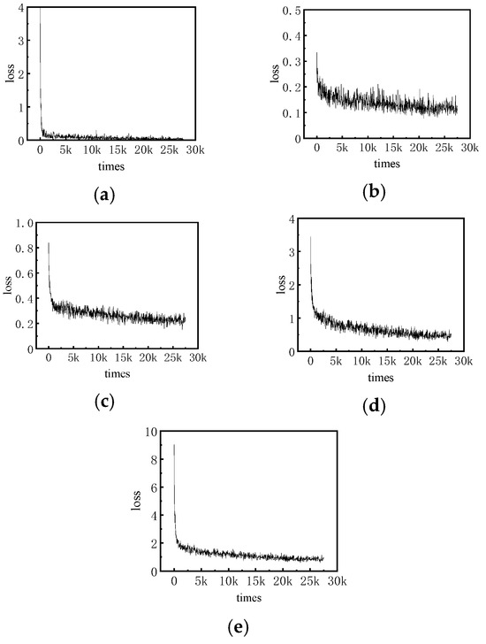 Figure 9a–d shows the classification loss, IOU loss, DIOU loss, and localization loss of the target detection network, which correspond to the classification, the degree of matching between the prediction frame and the truth frame, the distance between the prediction frame and the truth frame, and the localization task, respectively; Figure 9e is the total loss curve, which is the weighted sum of the first four types of loss values. It can be found that the four types of loss function curves and the total loss curve at the beginning of training very rapidly decline, then began to enter the fine-tuning phase (tune-turning), and finally the trend is gradually smooth and finally stabilized at a smaller value near, indicating that the network has been converted to a more optimal state. The curve trend reflects the training process of the network as well as the number of training rounds of the setup of the rationality. The curve trend reflects the rationality of the training process and the setting of the number of training rounds.