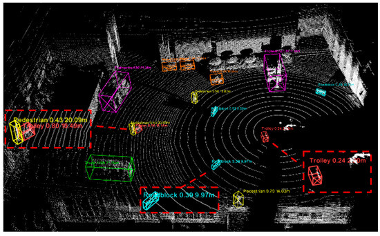 Figure 10 shows the detection effect of this 3D target detection network training model visualized in the demo, in which different color detection bounding boxes are set according to different categories and target categories, and confidence, distance, and other information are visualized. All targets appearing in the scene are all detected.