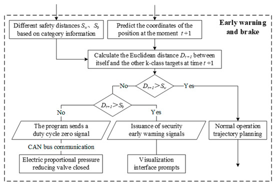 Returning to the safety warning strategy, as shown in Figure 12, using the prediction information as an input, a warning braking strategy framework is constructed. First, according to the different categories of information to delineate the different warning safety distance and braking safety distance , set the warning safety distance and braking safety distance to take into account that the excavator itself also exists in the safety radius . At the same time, using the Euclidean distance to calculate the position of the next moment of its own position and the other k categories of targets. distance , then determine whether the predicted distance is greater than the warning distance threshold ; if it is greater, then continue to maintain the use of real-time detection and tracking information for trajectory planning and other tasks, and vice versa. Then, enter into the next judgment logic, determine whether is greater than ; if it is greater, then send a warning signal to the visualization interface for prompting, and vice versa. Then, send an emergency stop signal and send a zero message to the proportional pressure-reducing valve through CAN bus communication to close the valve to achieve safety. The zero-setting message is sent to the electric proportional pressure reducing valve through CAN bus communication to close the valve port and realize safe emergency braking.