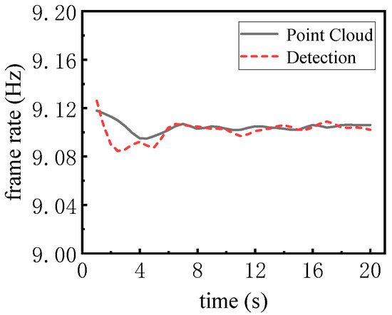 The theoretical scanning frame rate of LiDAR is 10 Hz, but the actual scanning to obtain the frame rate is only 90% of the theoretical value, so in order to verify the real-time situation of the actual operation of the detector, the real-vehicle point cloud input frame rate compared with the detection of the frame rate is shown in the Figure 18. It can be seen that as the detector is just started, there is a certain delay but, after 5 s, it tends to be stabilized.