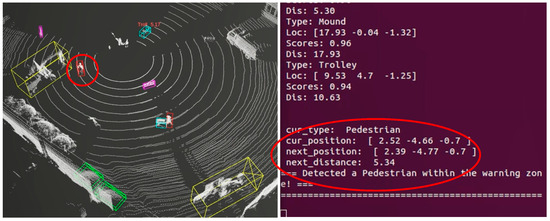 In order to verify the rationality and feasibility of the early warning braking strategy, the test is carried out. As shown in Figure 19, when the sensing system is running, a staff member is about to approach the excavator; according to the trajectory tracking, the system predicts that the target position of the next frame is in the range of the warning safety distance. At this time, the sensing system immediately sends out an early warning alert, suggesting that there are pedestrians in the non-safety zone, and sends the current position of the target and the predicted position of the next frame in real time to the visualization of the interactive interface.