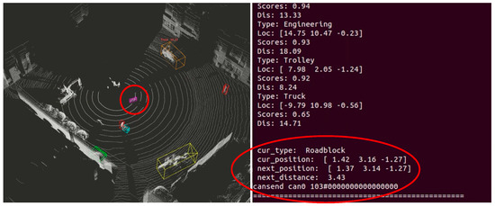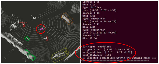 After the staff leaves the warning threshold range, the sensing system resumes normal operation. When the staff continues to drive into the warning threshold range of the roadblock, as shown in Figure 20, the sensing system sends the current position information of the roadblock as well as the relative predicted position of the next frame to the visualization interactive interface, and sends out a warning alert to inform that there is an obstacle in front of them.