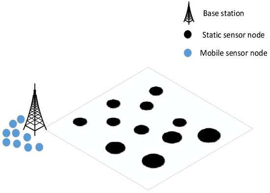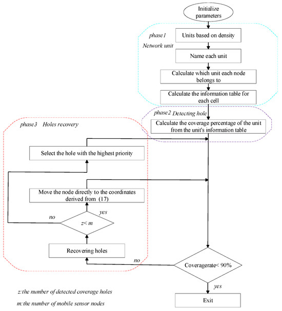 Wireless sensor networks (WSNs) represent a novel paradigm in computing and networking, characterized as a system consisting of minute, expensive, and highly intelligent devices, commonly referred to as sensor nodes [1,2]. A wireless sensor network (WSN) is a structure composed of numerous sensor nodes that communicate wirelessly. It is extensively utilized in the industrial field for detecting and monitoring key target areas, such as urban tracking and observation [3], environmental analysis [4], strategic surveillance [5], mobile target tracking [6], and smart home automation [7]. The deployment environment of a WSN is highly variable, presenting numerous challenges. Sensor nodes may be deployed in areas where the environment is harsh and manpower cannot work, and the death of a sensor node may be caused by its own factors such as the exhaustion of energy required by the node and hardware failure, as well as environmental factors such as inclement weather and external attacks. Once a node loses its sensing capability, it is unable to complete the information collection and reporting tasks within its original sensing range. The network area that has been well covered and monitored is damaged, and a network coverage hole is formed [8]. The coverage hole will impair data transmission and disconnect the connected network, resulting in unobservable critical events or inaccurate data, greatly reducing the integrity of the WSN in collecting information from the covered area, and degrading and destroying the functionality of the entire network. After a disaster, to ensure the communication quality and meet various rescue communication needs, it is necessary to restore the composite communication of the whole area in a high-efficiency way. Therefore, sensor nodes are deployed to complete the full coverage of the disaster area to achieve the recovery of basic communications.