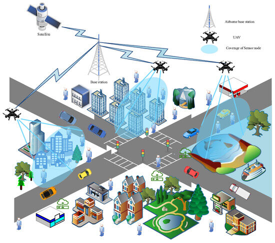 n static UAVs and m mobile UAVs are randomly deployed in the WSNs target area. The set of UAVs is defined as S = {S1, S2, …, Sn, Sn+1, …, Sn+m}, where Si = (xi, yi) (i = 1, 2, 3, …, n + m) is the position of each UAV.