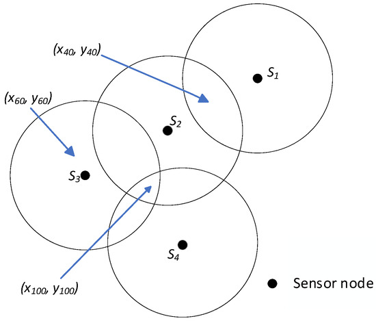 As shown in Figure 7, (x40, y40) is covered by two nodes S1 and S2, and (x100, y100) is covered by three nodes S2, S3, and S4. Therefore, the (x40, y40) entries in the columns of nodes S1 and S2 in Table 1 are 1. The (x100, y100) entries in the columns of nodes S2, S3, and S4 are 1. (x1, y1), (xk−1, yk−1), and (xk, yk) are not covered by any node. Hence, the table entries for these pixels are all 0 in Table 1. Additional pixels are also evaluated using this same method.