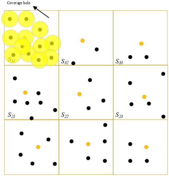 Since UAVs have limited battery energy, where the gradual depletion of energy leads to the dysfunction of some nodes, thus creating holes in the monitored area. The area covered by the node is calculated as a percentage of the area of the unit; if it is less than 90% then the unit is considered to have a coverage hole—as shown in Figure 2. For example, when the nodes at the dotted line run out of energy, resulting in the coverage area of this unit being less than 90 percent, the unit is considered to have a coverage hole.
