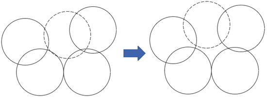 Then, PSO is used to determine the most necessary holes covered by using mobile nodes. There are m mobile nodes available for coverage hole recovery, and the number of detected coverage holes is z. When z ≤ m, the mobile nodes are directly sent to the coordinates derived from (17) for hole recovery, when the mobile nodes take into account the overlap rate with other nodes. As shown in Figure 10, the dashed position on the right side is the new position of the mobile node derived by the algorithm in this paper. When z > m, the highest priority hole is selected according to PSO. The steps in this phase of the proposed method are outlined as follows: