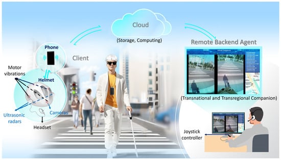 This project appreciates the support of the Zhuzhou Disabled Persons’ Federation and Big Data Resources Bureau of the High-tech Zone in the blind testing stage of the system. We also thank Hong Zhang and Rujun Dai for their valuable discussions on system development and promotion. Additionally, we would like to disclose that AI-generated content has been used in this manuscript. Specifically, the city and street background and central character images in Figure 1 were generated using the Midjourney AI system. The helmet worn by the central character and the mobile phone on his chest were added through post-editing, and the other modules surrounding the character, such as phone and helmet on the left, cloud on top, and remote backend agent on the right, were created through hand-drawing and/or screenshots of the system we developed. The AI-generated content is primarily focused on the background and central character images, and we made appropriate manual modifications to the image.