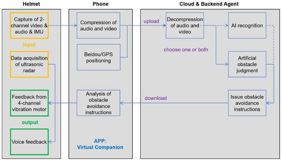 The entire system is illustrated in Figure 1. The system includes the client, who is equipped with a wearable helmet and a phone installed with the self-developed application (app) operating on an Android system, the cloud as a server for information computing and storage, and the remote backend agent. The remote backend agent is the part of the service that allows personnel to understand users’ needs, obtain information about the surrounding environment, and then provide navigation and environmental information to users.