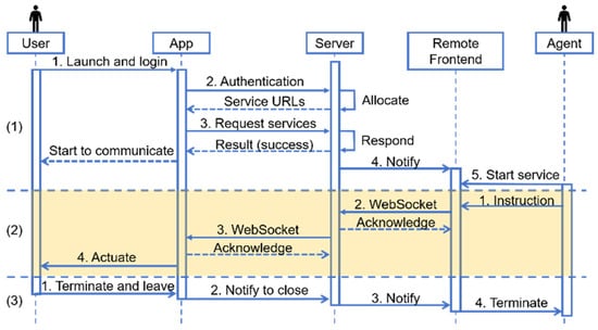 In MNVCS, the mobile app, server, and the backend used by agents were required to implement complex business logic. Figure 3 is the sequence diagram that describes the temporal logic among the mobile app, server, and agent frontend during the three representative processes of user service request and termination. (1) The user launched the app to log in. The authentication service on the server allocated services such as the audio and video service. After the app received the unique resource locators (URLs) of services, it requested the services so that channels between the app and server were built up. (2) The agent sent instructions to the user. The server played a role as a broker. The lighting region in the diagram means that all channels had been built. (3) The user terminated the app. The three components worked collaboratively with a clear temporal design, and their sub-modules were decoupled, so the system’s robustness was enhanced, making it safer and more reliable.