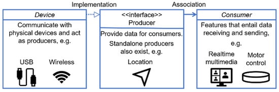 Diagram of the key classes of the mobile app. The key concepts included the device, producer, and consumer. A device class communicated with a physical device. A class implementing producer interface either provided data for or requested feedback from consumers. A consumer stood for a feature that involves data transmission.